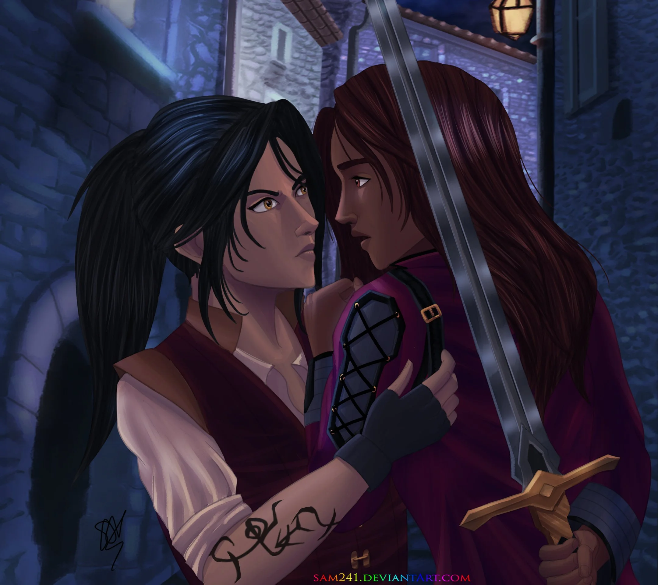 A scene from book 1 with Jessie (red) and Lahara (blue) sitting in an alleyway in the rain